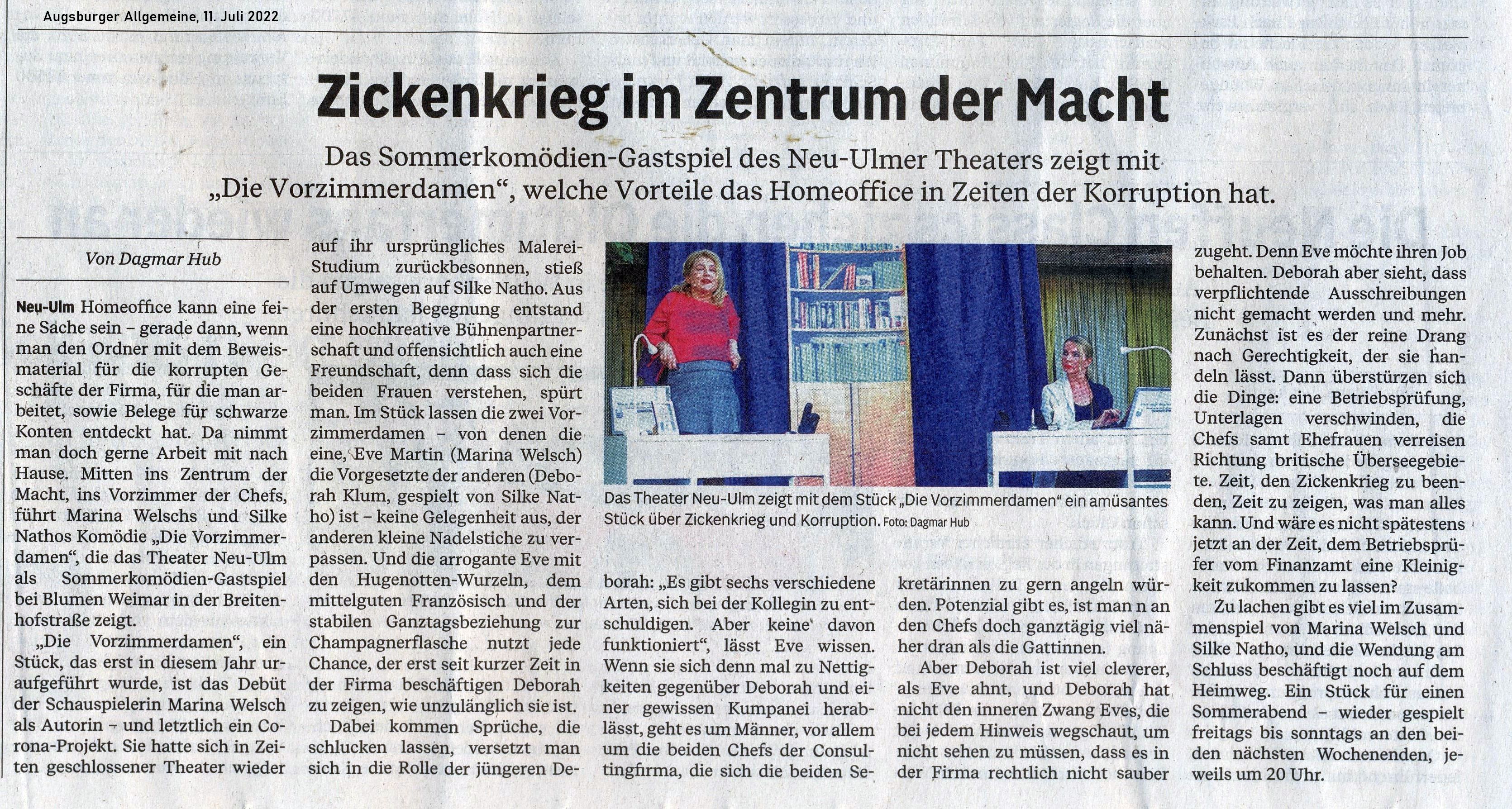 "Die Vorzimmerdamen" laden zu zwei Stunden intelligenter und prickelnder Unterhaltung ein. Ladylike, witzig und mit einem triumphalen Happy-End(ing)! Stoßen Sie mit uns an: Auf Gerechtigkeit, Befreiung und auf Champagner! Viel Champagner!