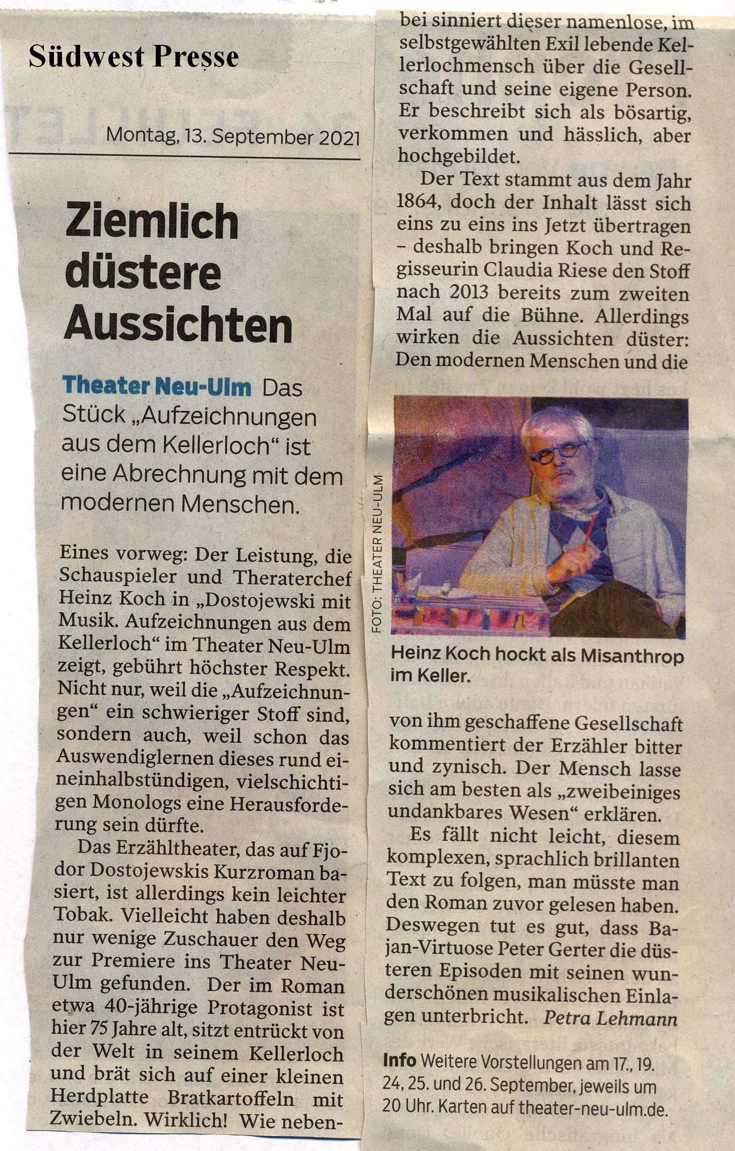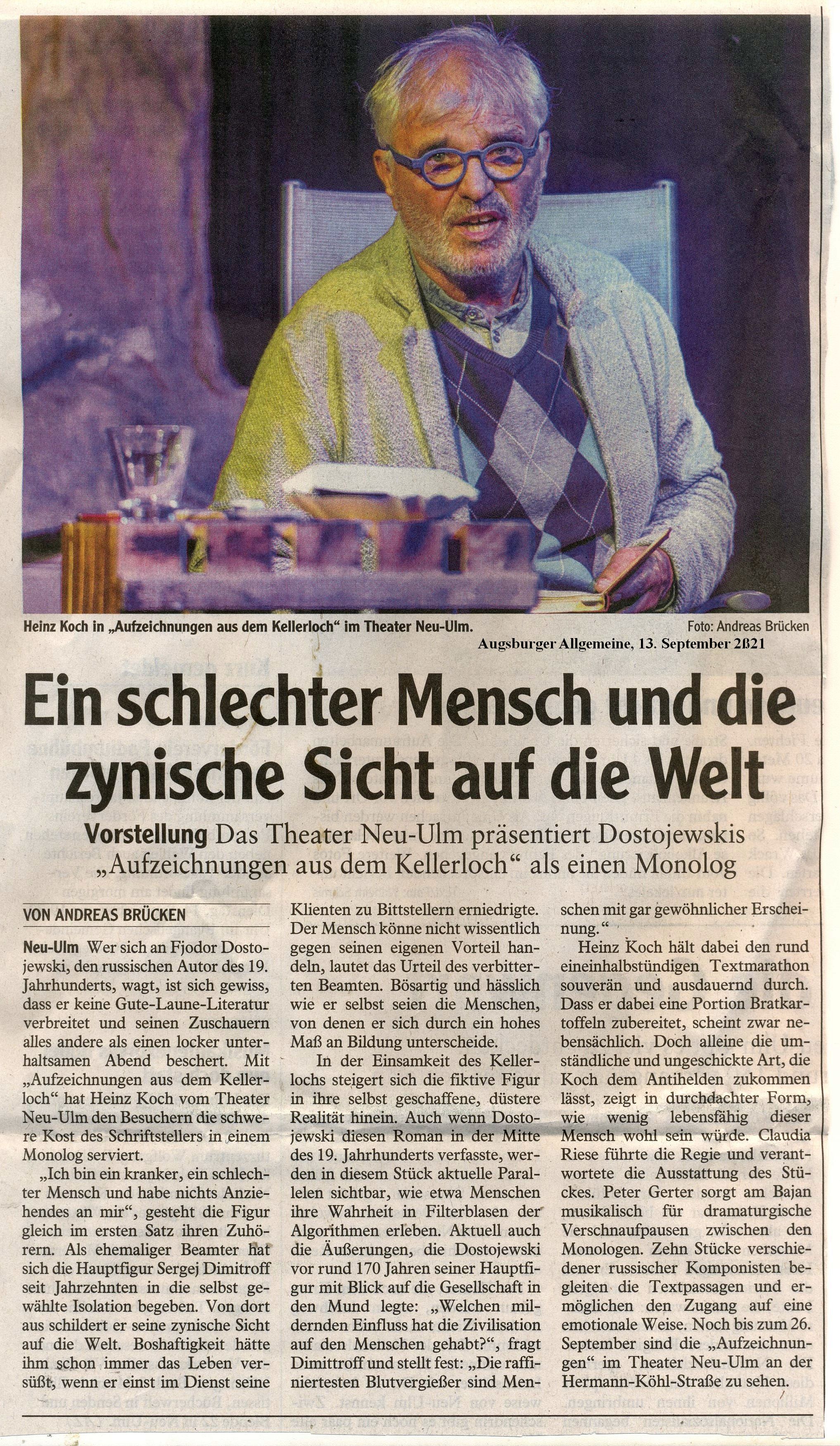 Deshalb hat sich das Neu-Ulmer Theater auch gern mit den "Aufzeichnungen aus dem Kellerloch" befasst und sie für die Bühne bearbeitet. Heinz Koch bringt zentrale Passagen dieses auf- und anregenden, zu Teilen auch amüsierenden Textes.