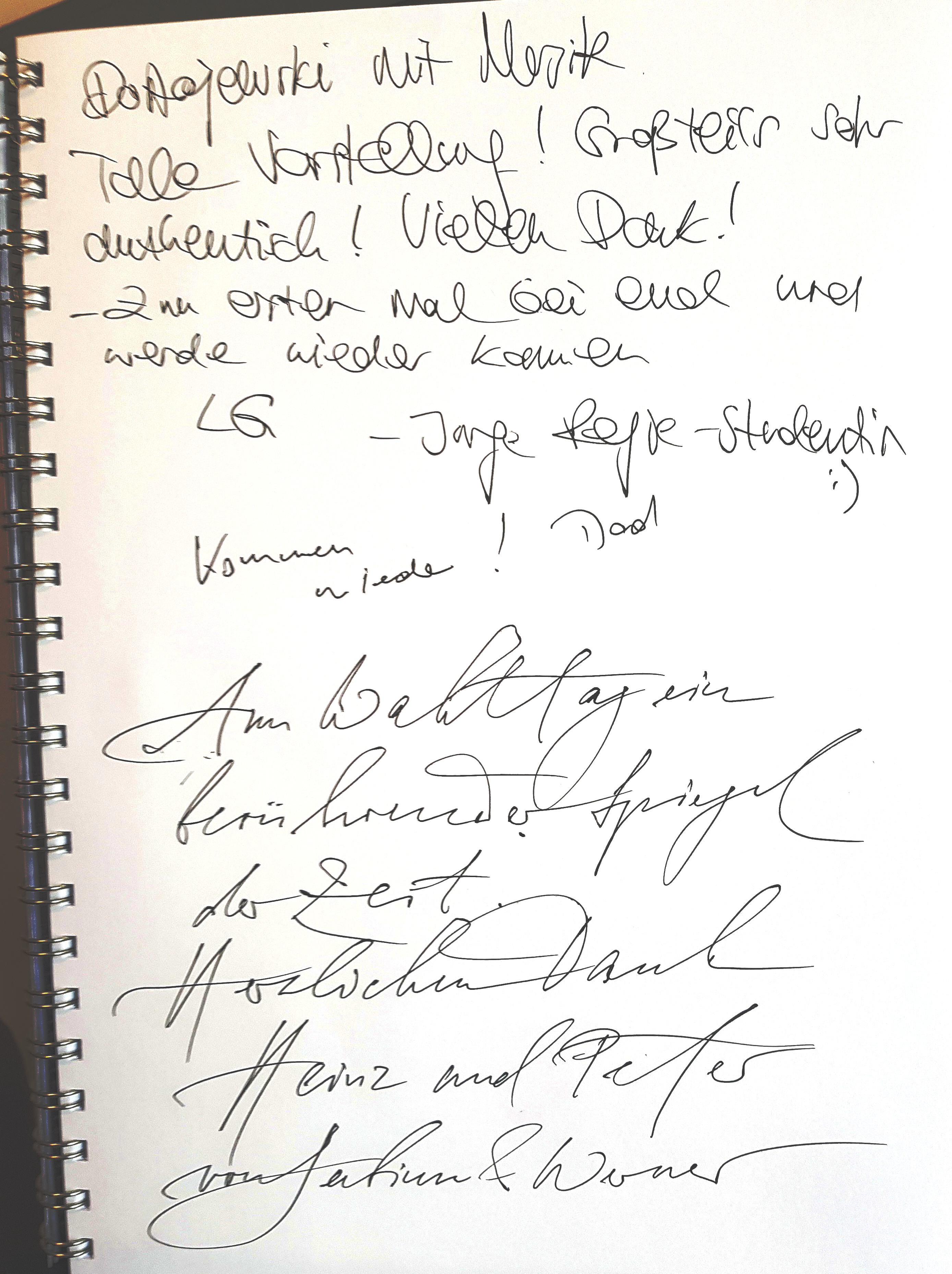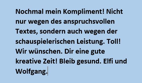 Nimmt man ihn pur, hat er auch den Menschen unserer Tage jede Menge zu sagen. Das beweisen wir mit unserer Inszenierung. Nicht umsonst haben immer mehr Bühnen das Werk entdeckt und aufgeführt. Hier Links zu etlichen anderen Inszenierungen Die Bloggerin des "Herz im Kopf Blog": "Wenn Dostojewskij weinte, weint er diamantengleiche Erkenntnisse über die menschliche Natur und Gesellschaft. Jeder sollte ihn lesen." Zum vollständigen blog-post hier |