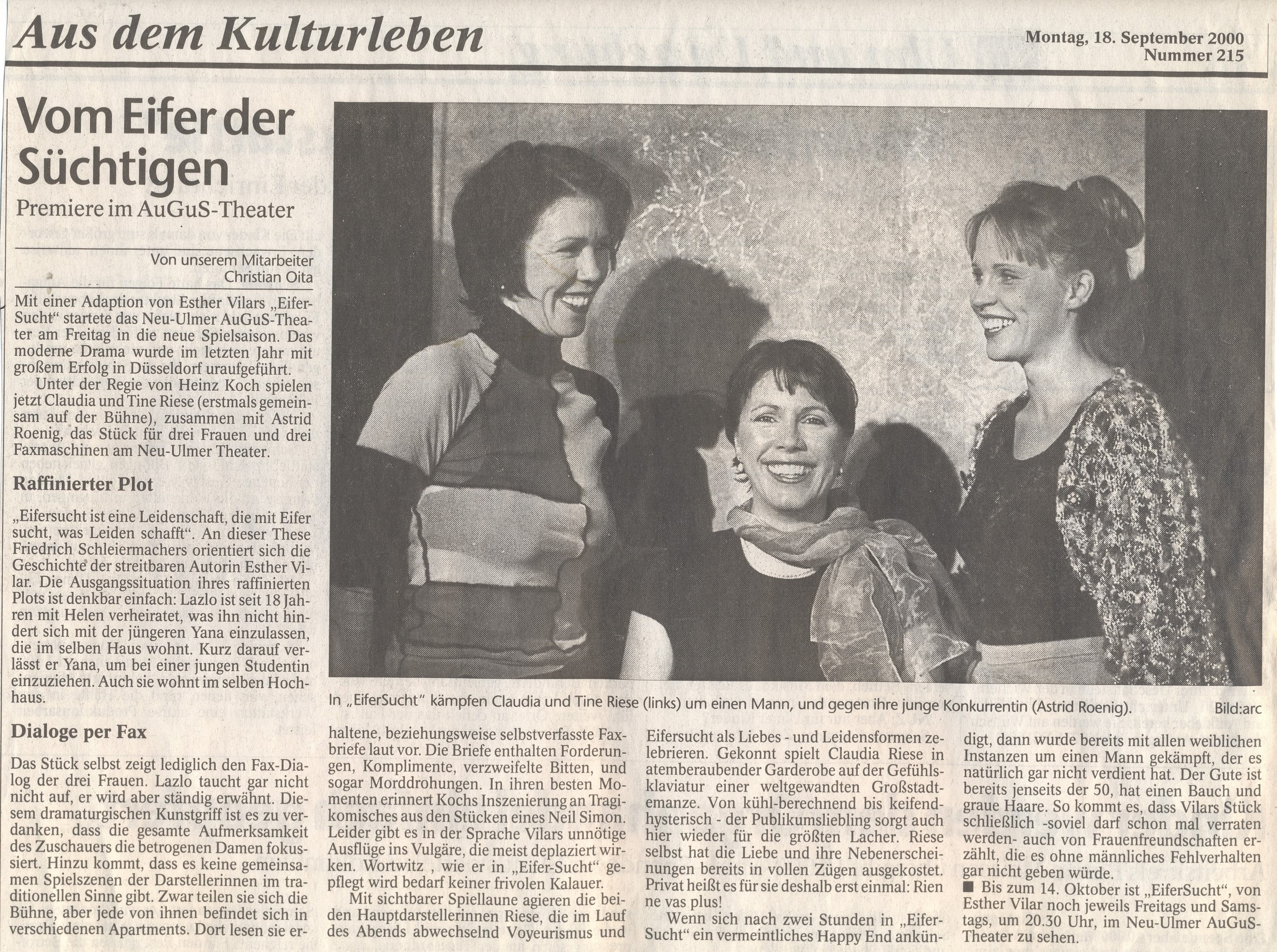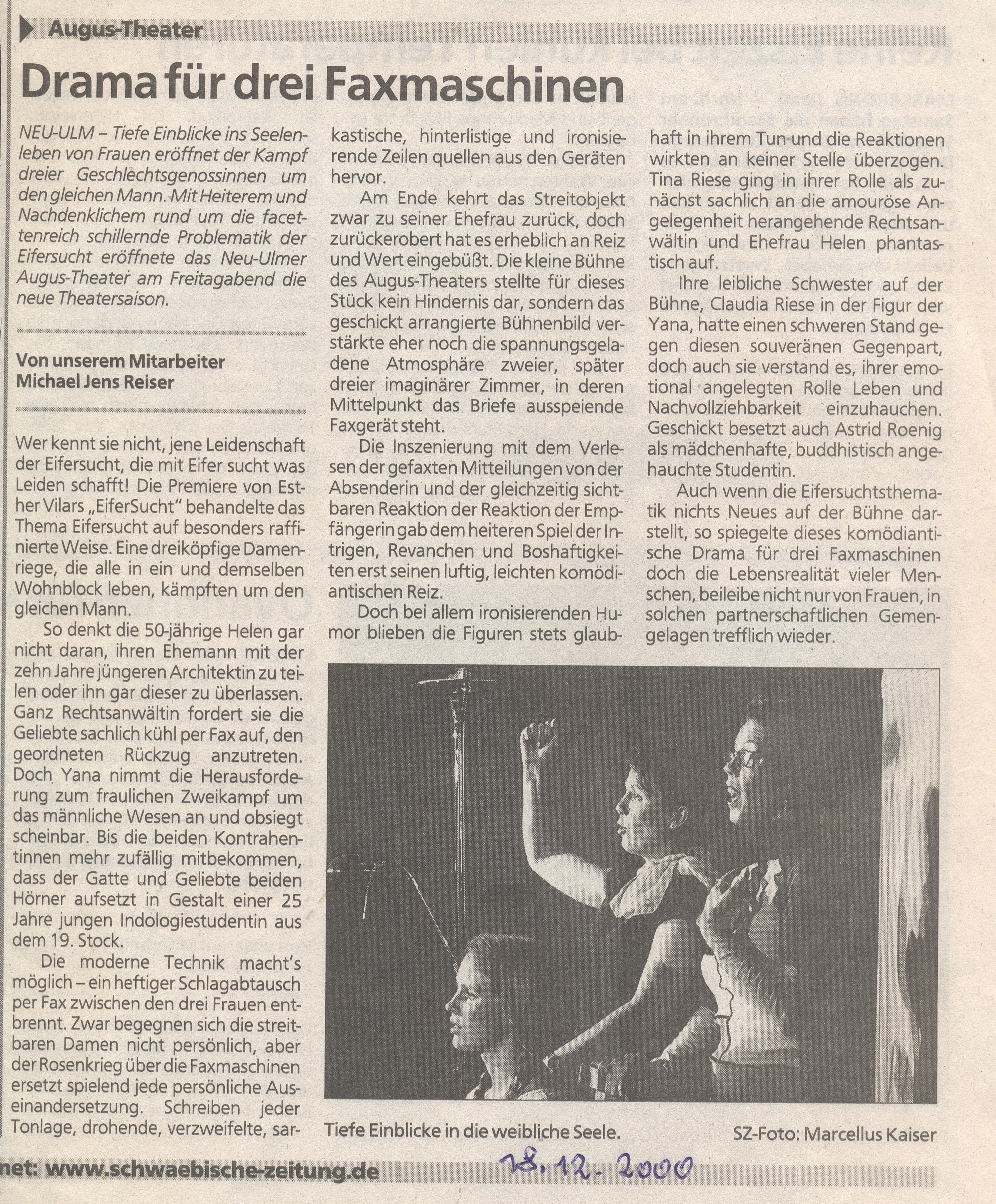 Vom Eifer der SüchtigenPremiere im AuGuS-TheaterVon unserem Mitarbeiter Christian Oita Mit einer Adaption von Esther Vilars "Eifer-Sucht" startete das Neu- Ulmer AuGuS-Theater am Freitag in die neue Spielsaison. Das moderne Drama wurde im letzten Jahr mit großem Erfolg in Düsseldorf uraufgeführt. Unter der Regie von Heinz Koch spielen jetzt Claudia und Tine Riese (erstmals gemeinsam auf der Bühne), zusammen mit Astrid Roenig, das Stück für drei Frauen und drei Faxmaschinen am Neu- Ulmer Theater. Raffinierter Plot "Eifersucht ist eine Leidenschaft, die mit Eifer sucht, was Leiden schafft". An dieser These Friedrich Schleiermachers orientiert sich die Geschichte der streitbaren Autorin Esther Vilar. Die Ausgangssituation ihres raffinierten Plots ist denkbar einfach: Lazlo ist seit 18 Jahren mit Helen verheiratet, was ihn nicht hindert sich mit der jüngeren Yana einzulassen, die im selben Haus wohnt. Kurz darauf verlässt er Yana, um bei einer jungen Studentin einzuziehen. Auch sie wohnt im selben Hochhaus. Dialoge per Fax Das Stück selbst zeigt lediglich den Fax- Dialog der drei Frauen. Lazlo taucht gar nicht nicht auf, er wird aber ständig erwähnt. Diesem dramaturgischen Kunstgriff ist es zu verdanken, dass die gesamte Aufmerksamkeit des Zuschauers die betrogenen Damen fokussiert. Hinzu kommt, dass es keine gemeinsamen Spielszenen der Darstellerinnen im traditionellen Sinne gibt. Zwar teilen sie sich die Bühne, aber jede von ihnen befindet sich in verschiedenen Apartments. Dort lesen sie erhaltene, beziehungsweise selbstverfasste Faxbriefe laut vor. Die Briefe enthalten Forderungen, Komplimente, verzweifelte Bitten, und sogar Morddrohungen. In ihren besten Momenten erinnert Kochs Inszenierung an Tragi-komisches aus den Stücken eines Neil Simon. Leider gibt es in der Sprache Vilars unnötige Ausflüge ins Vulgäre, die meist deplaziert wirken. Wortwitz, wie er in "Eifer-Sucht" gepflegt wird bedarf keiner frivolen Kalauer. Mit sichtbarer Spiellaune agieren die beiden Hauptdarstellerinnen Riese, die im Lauf des Abends abwechselnd Voyeurismus und Eifersucht als Liebes - und Leidensformen zelebrieren. Gekonnt spielt Claudia Riese in atemberaubender Garderobe auf der Gefühlsklaviatur einer weltgewandten Großstadtemanze. Von kühl-berechnend bis keifend- hysterisch - der Publikumsliebling sorgt auch hier wieder für die größten Lacher. Riese selbst hat die Liebe und ihre Nebenerscheinungen bereits in vollen Zügen ausgekostet. Privat heißt es für sie deshalb erst einmal: Rien ne vas plus! Wenn sich nach zwei Stunden in "EiferSucht" ein vermeintliches Happy End ankündigt, dann wurde bereits mit allen weiblichen Instanzen um einen Mann gekämpft, der es natürlich gar nicht verdient hat. Der Gute ist bereits jenseits der 50, hat einen Bauch und graue Haare. So kommt es, dass Vilars Stück schließlich - soviel darf schon mal verraten werden- auch von Frauenfreundschaften erzählt, die es ohne männliches Fehlverhalten gar nicht geben würde. Neu-Ulmer Zeitung, Montag, 18. Sept. 00 |