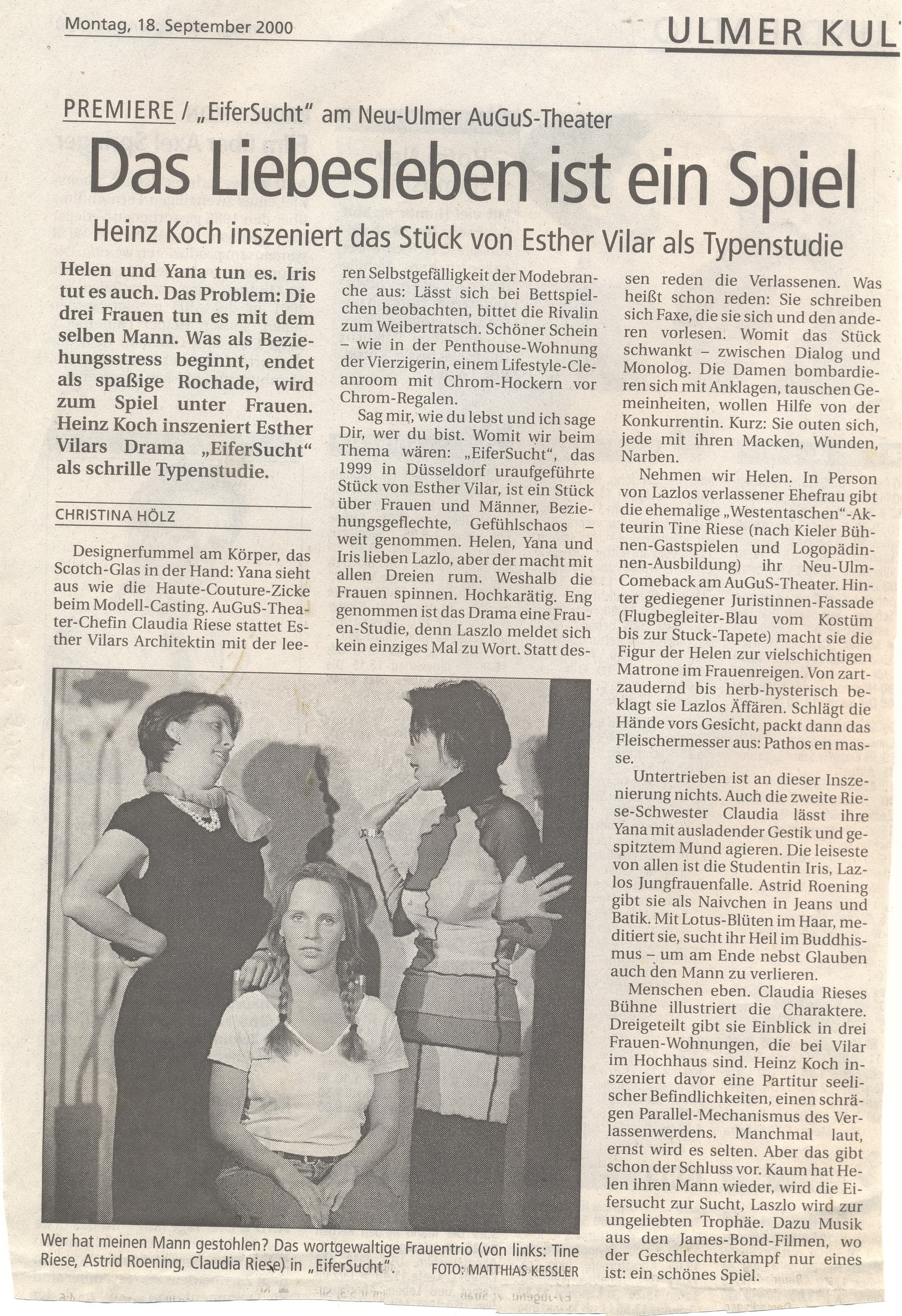 Zum StückDas Stück „EiferSucht“ behandelt das Thema Eifersucht auf besonders raffinierte Weise. Drei Frauen (Helen; Yana; Iris) und ein Mann. Er, Lazlo, ist seit 18 Jahren mit Helen verheiratet, was ihn nicht hindert, sich erst mit Yana einzulassen, um diese dann wenig später auch zu verlassen, wegen Iris. Die drei Frauen wohnen im selben Hochhaus. Sie bekommen irgendwie von einander und von der Untreue Lazlos Wind, treffen sich aber nicht, sondern schreiben sich Faxe, böse, verzweifelte, sarkastische, witzige, emotionale, argumentative, bissige, in jeder Tonart. Es geht um große Gefühle, Liebe und - das noch größere: EiferSucht. Vor allem das Finale ist furios. Doch in letzter Konsequenz ist das Objekt der EiferSucht, der Mann, der eigentliche Verlierer. Von (s)einer Frau zurückerobert, verliert er seinen Wert.Am 16. September 1935 wird Esther Vilar in Buenos Aires geboren. Ihr Vater musste aufgrund seiner jüdischen Abstammung nach Argentinien emigrieren, ihre – ebenfalls deutsche – Mutter begleitete ihn dorthin. Vilars Eltern sind nicht besonders reich. Und so muss sie ihr Medizinstudium in kürzester Zeit an der Universität von Buenos Aires absolvieren und wird mit 21 Jahren die jüngste Ärztin Südamerikas. Nach Beendigung ihres Studiums kommt Esther Vilar mit einem Stipendium in die Bundesrepublik, in das Land, von dem ihre Mutter immer geschwärmt hatte. Dieser Auslandsaufenthalt sollte ihr Leben verändern. Zum ersten Mal bekommt sie Gelegenheit, ausgiebig zu lesen – und das tut sie fast ein ganzes Jahr lang. Von da an weiß sie, daß sie schreiben will und zwar 'hauptberuflich'. Doch zuerst arbeitet Esther Vilar noch zwei Jahre lang als Ärztin, dann widmet sie sich ganz der Schriftstellerei. Der große Durchbruch gelingt der Autorin 1971 mit dem "Dressierten Mann". Während eines Aufenthaltes in New York schreibt Vilar dieses Buch mit provokanten Thesen über die Ausbeutung des Mannes durch die Frau. Nach ihrem Auftritt in Dietmar Schönherrs "Wünsch Dir was" (der ersten TV-Talkshow in Deutschland) wird die Schriftstellerin 'über Nacht' zu einer der medienwirksamsten, weil polarisierendsten Autorinnen des Landes. |