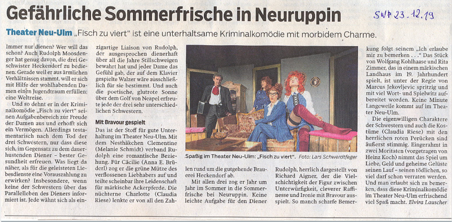 "Das Publikum im fast ausverkauften Saal leidet mit, fiebert mit.. Natürlich gab es Lacher am laufenden Band; dies soll und darf bei einer Komödie auch gar nicht anders sein. Hinter aller Komik ist jedoch auch der Mensch erkennbar, die Menschheit, die Gesellschaft. Nicht nur jene, des vorvergangenen Jahrhunderts."Die ganze Rezension der Neu-Ulmer Zeitung hier.