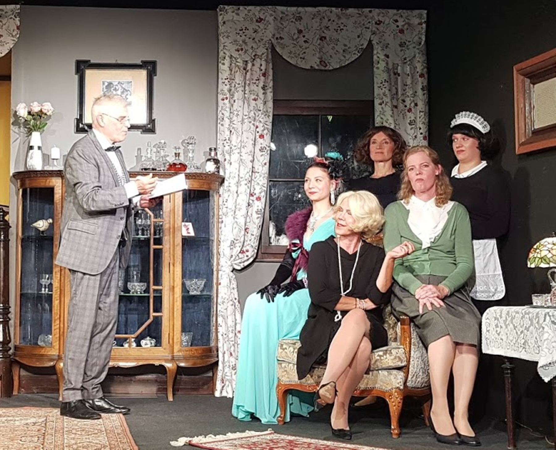 Das mörderische Quintett: Mrs Worthing (Anna-Elisabeth Brüderl, hinten links), Ruby (Melanie Schmidt, hinten rechts), Vera Ratow (Helga Reichert, vorn rechts), Jane Heartstone (Laura Becker, vorne links), Mrs Heartstone (Claudia Riese, Mitte vorn). Chiefinspector Hollister (Heinz Koch).