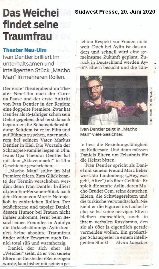 "Ob uns die gestrige Vorstellung von 'Macho Man' gefallen hat? 'Gefallen' ist gar kein Ausdruck. Wir waren begeistert! Herr Dentler hat auf der Bühne Großes geleistet.