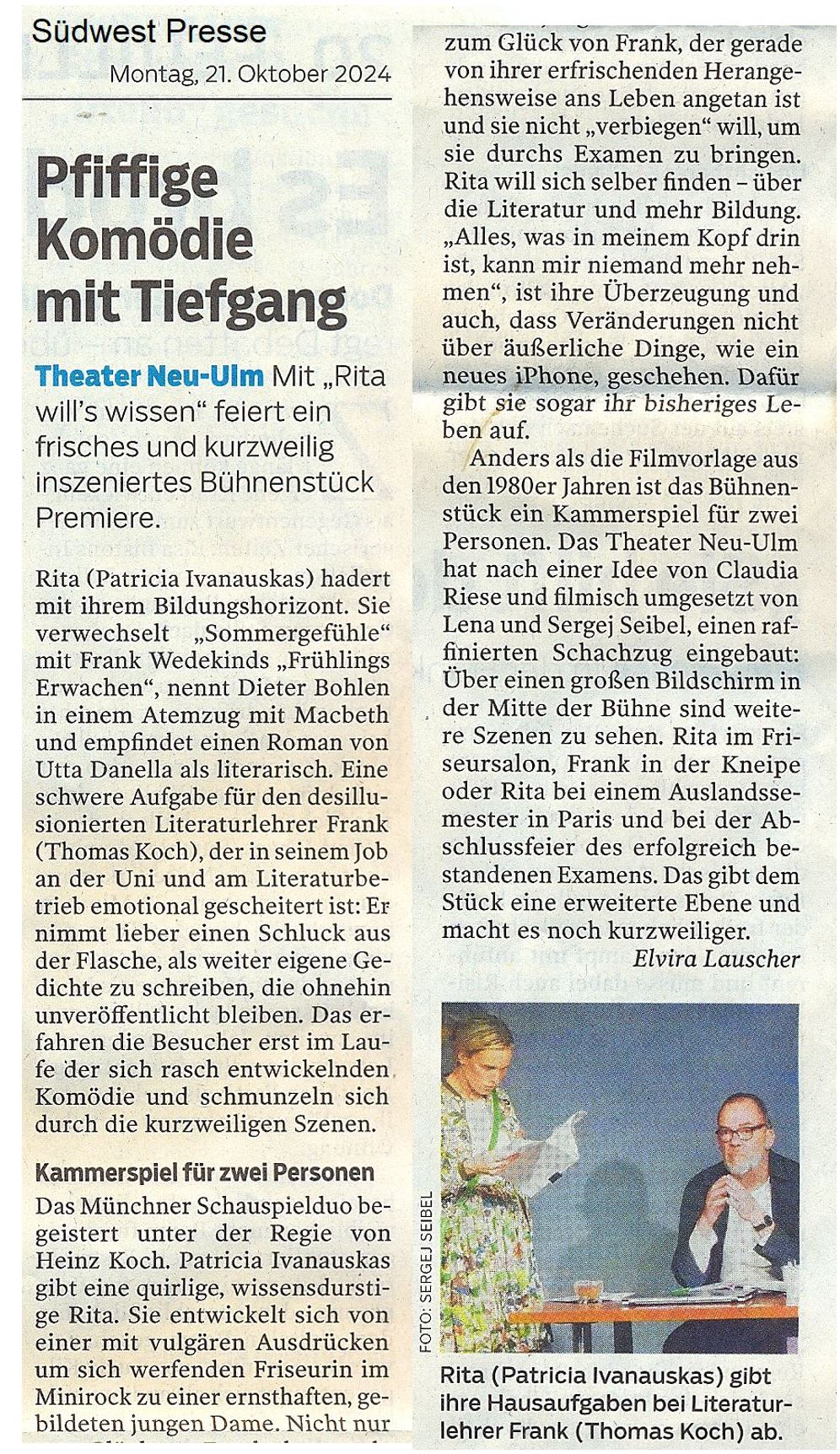 "Rita will’s wissen" ist eine atemberaubende Komödie – ein wenig wie Eliza Doolittle. Und ein wenig wie "Shirley Valentine. Die hl. Johanna der Einbauküche", der anderen unserem Publikum bereits bekannten Komödie aus der Feder des englischen Autors Willy Russel. Eliza, Shirley und auch Rita - drei Frauen, die zu sich selber finden (wollen).Die aufgeweckte und um keinen guten Spruch verlegene Friseurin Rita meint, sie brauche mehr Bildung. Sie belegt einen Literaturkurs an der Uni bei Frank - und mischt unweigerlich diesen desillusionierten, dem Alk verfallenen Dozenten mächtig auf.