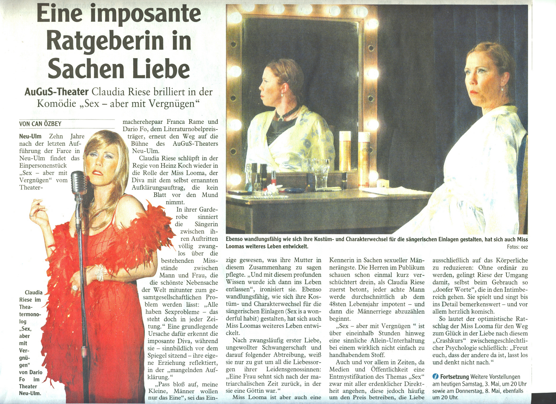 Eine imposante Ratgeberin in Sachen LiebeClaudia Riese brilliert in der Komödie "Sex - aber mit Vergnügen!"von Can Özbey Hier der Original-Artikel aus der Neu-Ulmer Zeitung vom Samstag, 03. Mai 2008 Und hier die online-Version.