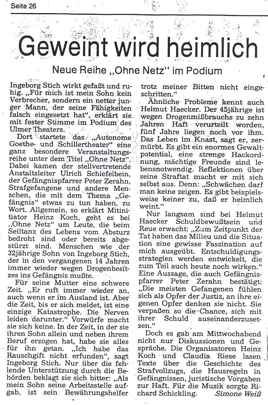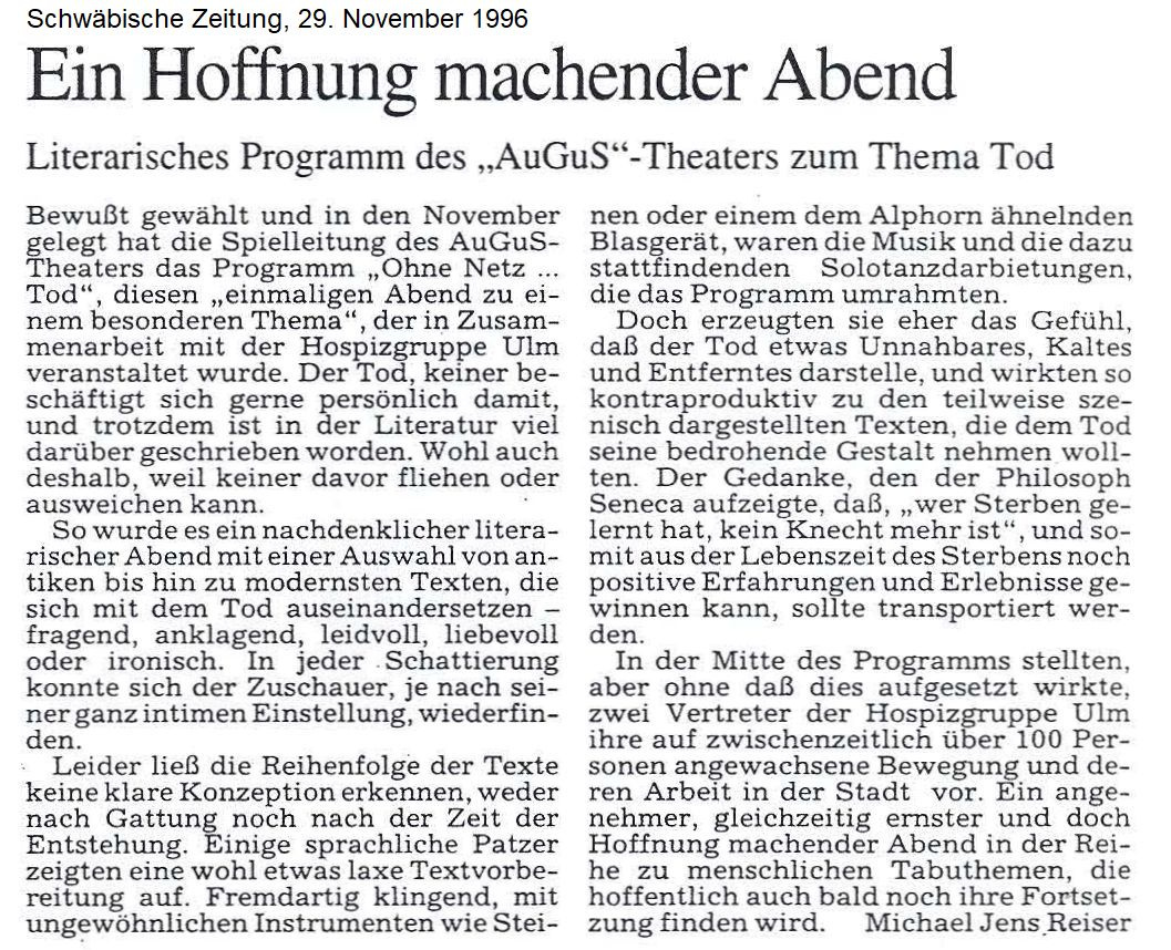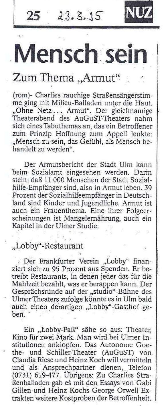 Dazu gehören auch die "Ohne Netz ..."-Abende. In denen werden Tabu-Themen wie Tod, Sterben, Knast, Folter, Armut, Fremdsein auf die Bühne gebracht, und zwar in einmaligen Aufführungen; Texte, Szenen, Musik und Gespräche wechseln.