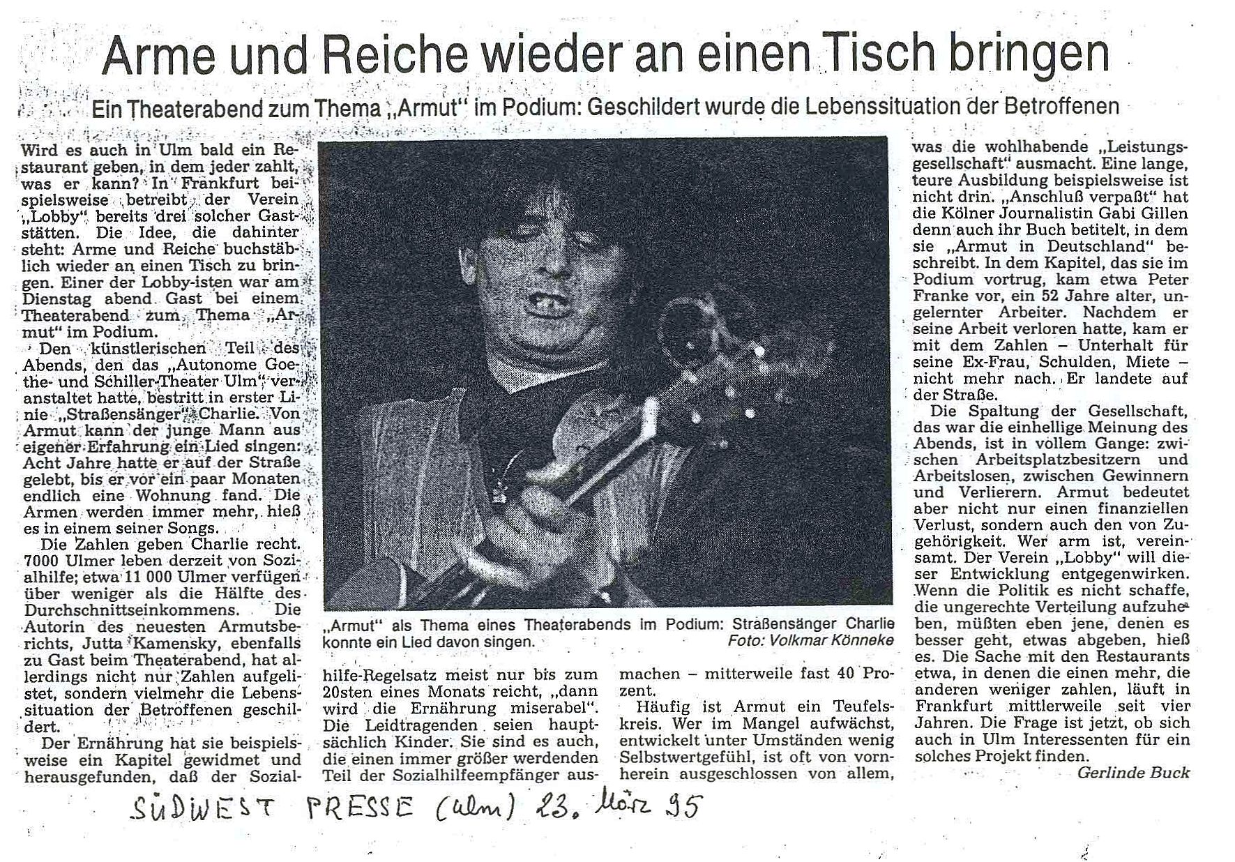 "... Leuten mit wenig Geld soll in einer weitgespannten bürgerschaftlichen Aktion geholfen werden. Das Ziel: Auch wer über weniger als die Hälfte des Durchschnittseinkommens verfügen kann und damit nach europäischer Definition als arm gilt, soll am öffentlichen und kulturellen Leben teilhaben können.Die Lobby-Card soll ihren ansonsten benachteiligten Inhaber(inne)n Türen öffnen, Rabatte ermöglichen, zu erschwinglichen Preisen verhelfen. Wer die LobbyCard akzeptiert, versteht sich als Teil einer Lobby für die Leute, die sonst keine Lobby haben.